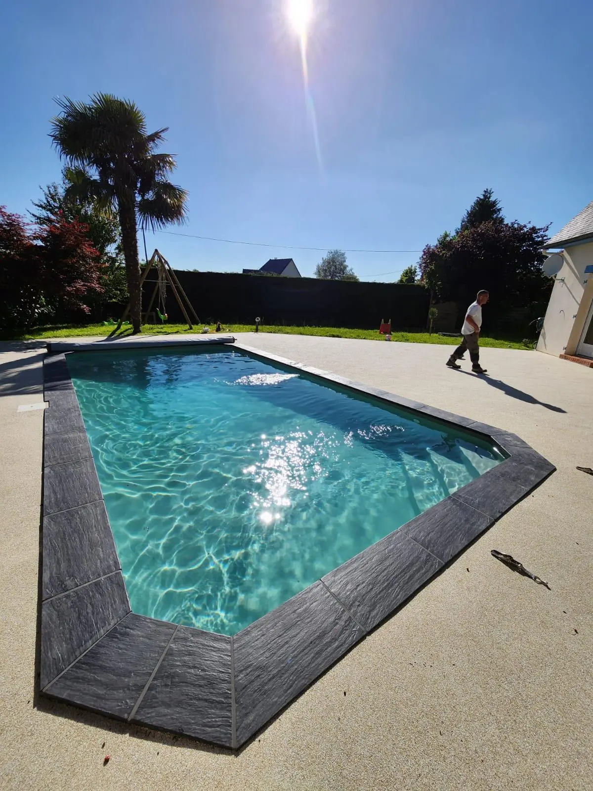 Options de finition : Vous pouvez choisir un revêtement en pierre naturelle, carrelage, liner couleur, ou béton ciré, pour un style résolument moderne ou plus rustique.