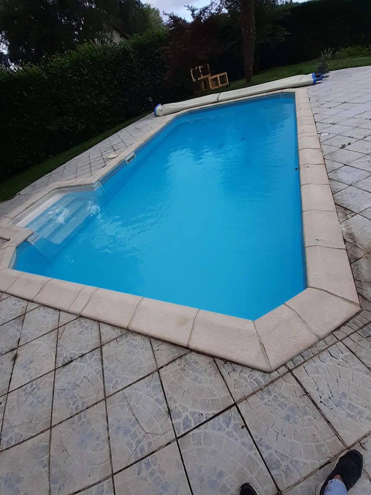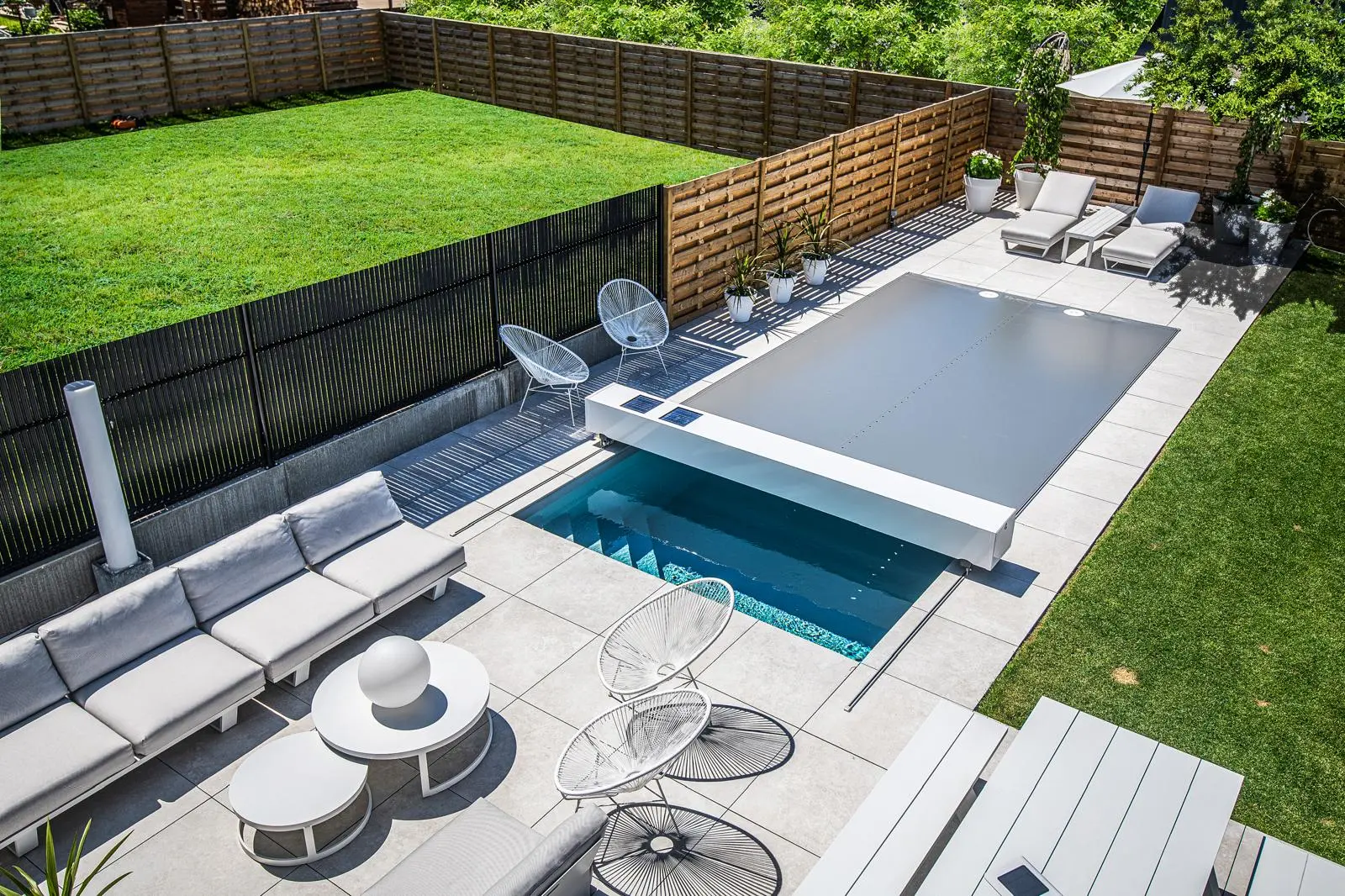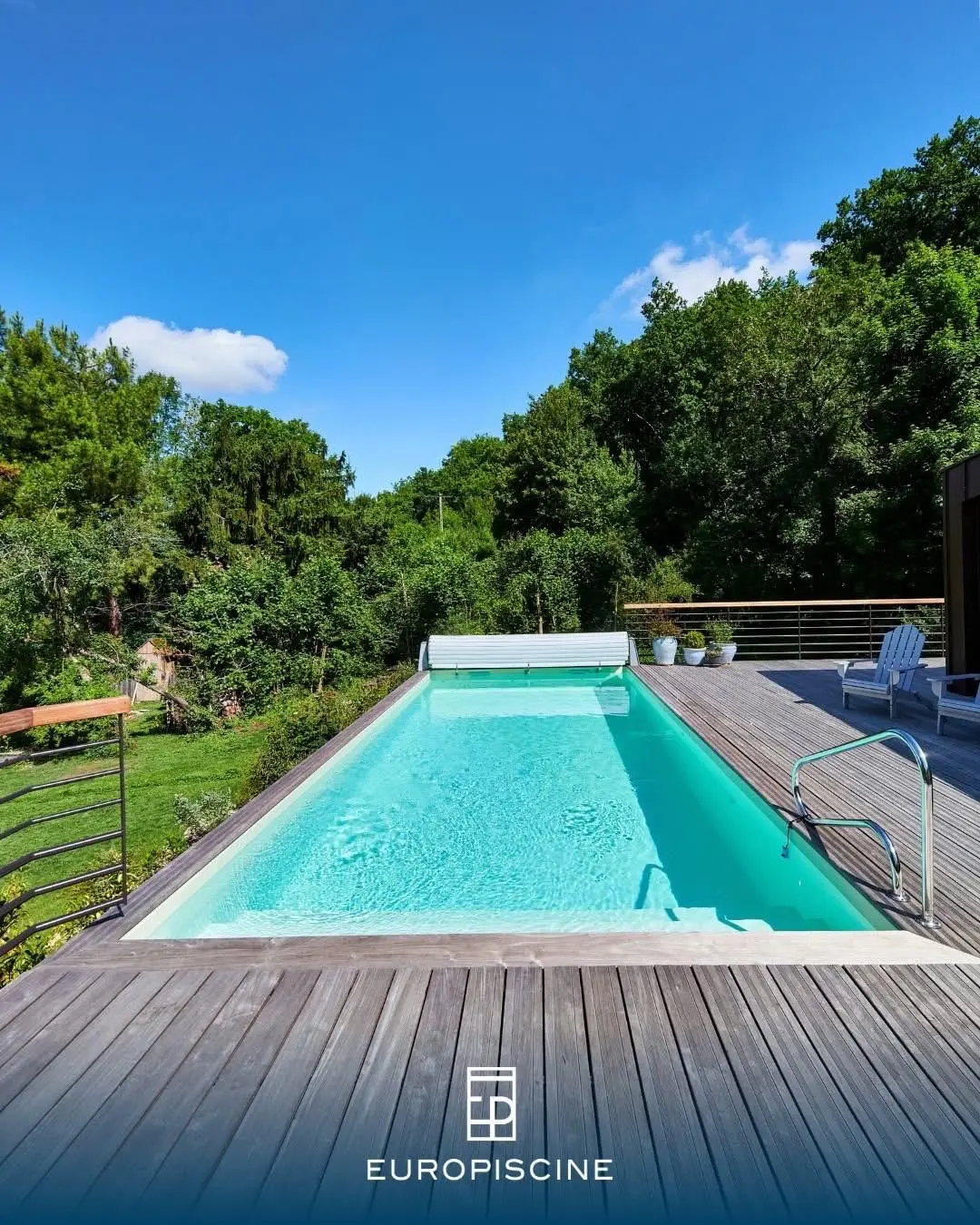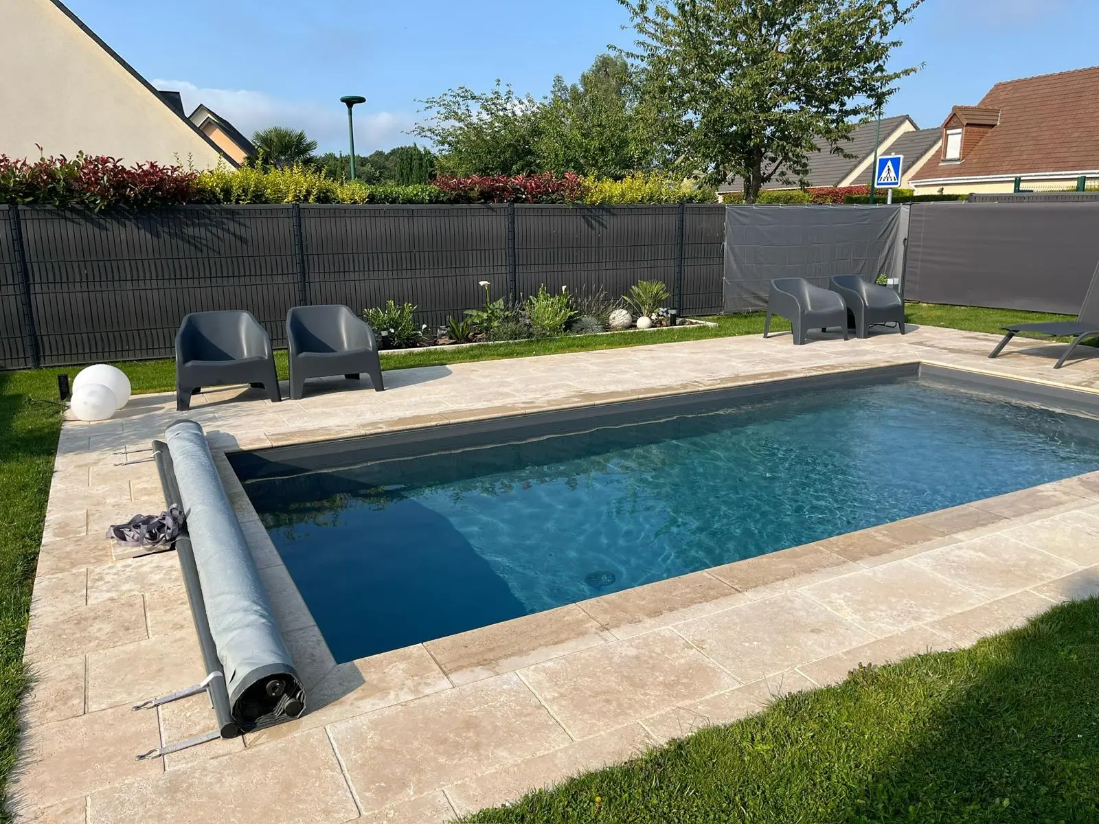 L’escalier Roman a été retiré pour faire place à une plage immergée. Le liner a été remplacé par une membrane armée gris anthracite. Enfin, le volet immergé a été remplacé par une couverture de sécurité @Coverseal (3), optimisant ainsi l’espace dans le bassin. ✨